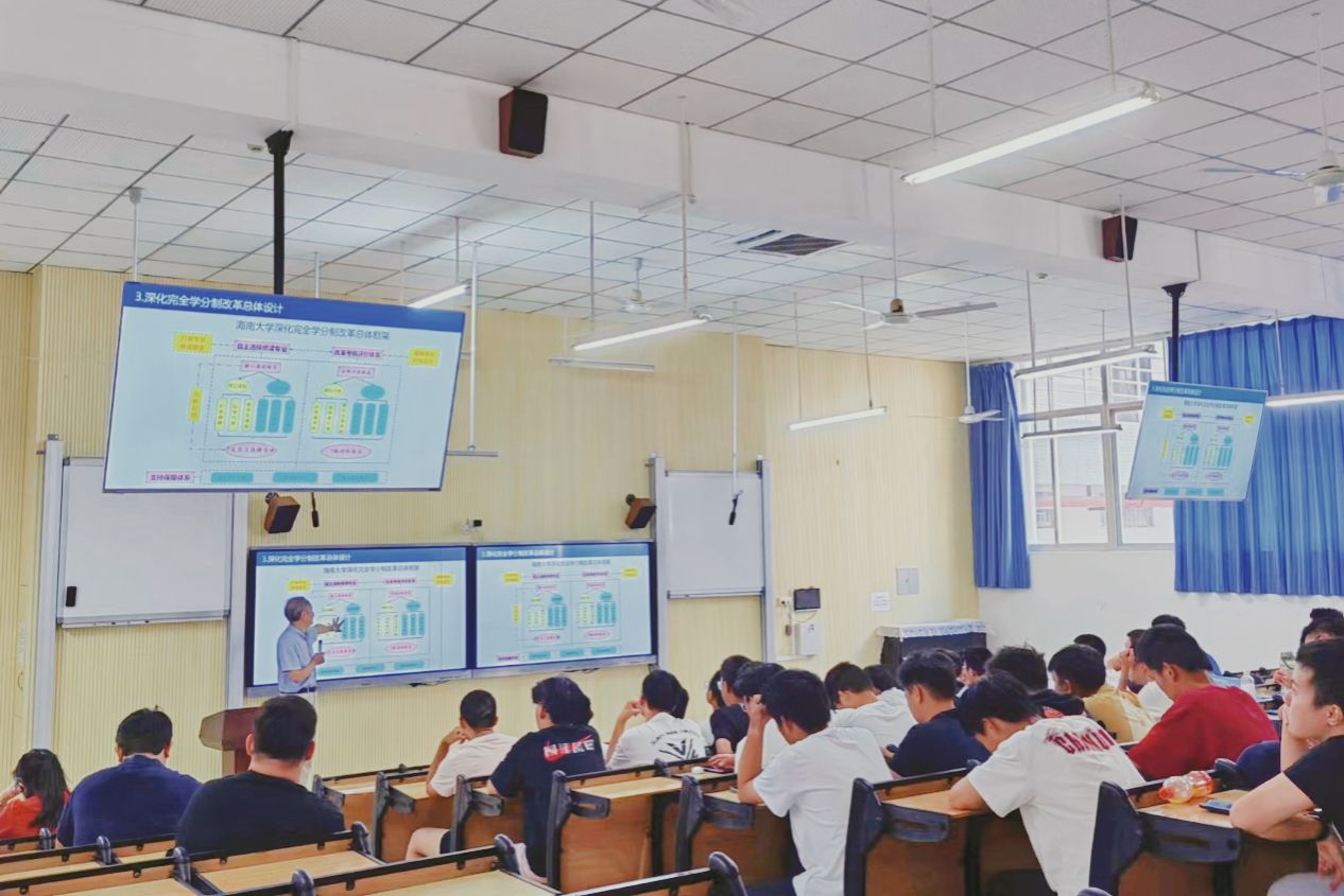 本站訊(通訊員 余力力)9月26日下午,海南大學深化完全學分制改革政策解讀交流會首場活動在5教111教室舉行。教務處處長王志剛、副處長趙銀梅,子衿書院黨委書記李海朋,教務處教材科科長余力力,子衿書院2024級輔導員李健,以及子衿書院2024級新同學代表100余人參加了交流。王志剛進行政策介紹。余力力 攝現場問答交流。余力力 攝王志剛處長就學校深化完全學分制改革的制度設計、具體配套政策進行了介紹和深入解讀,并圍繞同學們現場提出的自主選擇專業、...