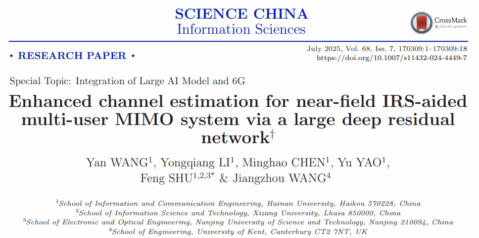 近日,信息與通信工程學(xué)院束鋒教授團(tuán)隊在《SCIENCE CHINA Information Sciences》(中科院一區(qū)TOP期刊,CCF A刊,影響因子為7.6)期刊上發(fā)表題為“Enhanced channel estimation for near-field IRS-aided multi-user MIMO system via a large deep residual network”的研究論文。信息與通信工程學(xué)院2022級博士生王艷為文章第一作者,束鋒教授為通信作者,海南大學(xué)為第一單位。該團(tuán)隊研究認(rèn)為,未來6G網(wǎng)絡(luò)將采用大規(guī)模/超大規(guī)模天線陣列、...