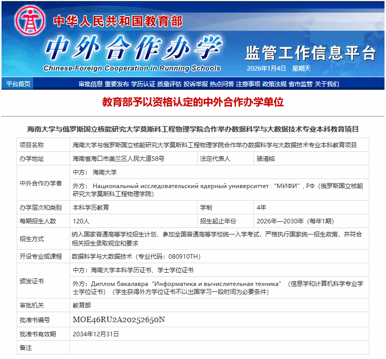 近日,據(jù)教育部網(wǎng)站公布信息,我校與俄羅斯國立核能研究大學(xué)莫斯科工程物理學(xué)院合作舉辦的數(shù)據(jù)科學(xué)與大數(shù)據(jù)技術(shù)專業(yè)本科教育項(xiàng)目正式獲批。該項(xiàng)目是海南大學(xué)深入貫徹落實(shí)習(xí)近平總書記“要支持海南大學(xué)創(chuàng)建世界一流學(xué)科”重要指示精神,推動(dòng)高水平教育對外開放的又一重要成果,旨在服務(wù)國家戰(zhàn)略,為海南自由貿(mào)易港建設(shè)培養(yǎng)具備國際視野的新一代信息技術(shù)高端人才。作為項(xiàng)目辦學(xué)單位,網(wǎng)絡(luò)空間安全學(xué)院(密碼學(xué)院)將依托自身在信息安全、...