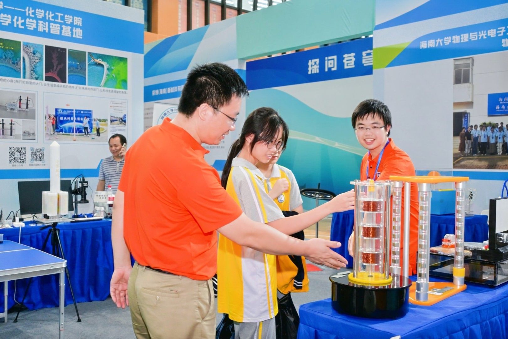 本次全國科普日主場活動聚焦“五個圖強”,舉辦“農業芯片”、“挺進深藍”、“探問蒼穹”、“逐綠前行”、“產業集群”等五大產業科普主題展,專設“臺風里的科普”、“這里是儋州”、“科普嘉年華”等特色專題展,凝聚101家單位400余項優質展教資源。作為海南省科普素質提升工作的重點實施單位,海南大學積極響應本次“全國科普日”活動,海南大學南海海洋資源利用國家重點實驗室、物理科普基地、化學科普基地、保亭研究院、科技小院、南繁學院等8家單位在“向綠圖強”、“向海圖強”、“科普嘉年華”等主題板塊分設多個展臺,活動現場人潮涌動,氣氛熱烈。