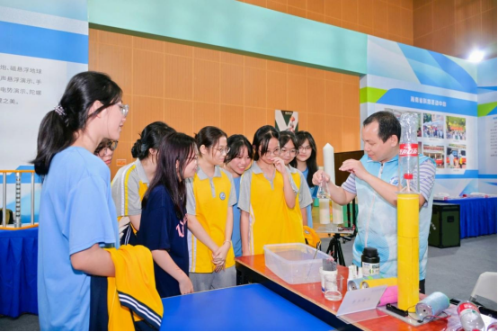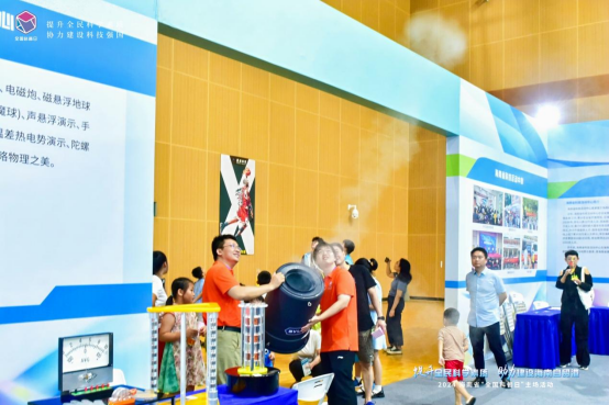 這是海南大學物理與光電工程學院、基礎物理實驗教學中心物理科普基地帶來的龐大又酷炫的“空氣炮”裝置,不少青少年圍觀并參與“炮彈”的發射,在聲聲驚嘆中增加了學習科學知識的興趣。此外,展臺還設置了直升飛機演示角動量守恒裝置、磁生電演示儀、“懶惰管”演示儀、陀螺儀等數十種可供互動的演示裝置,將生活中隨處可見的物理現象通過實驗的方式演示出來。