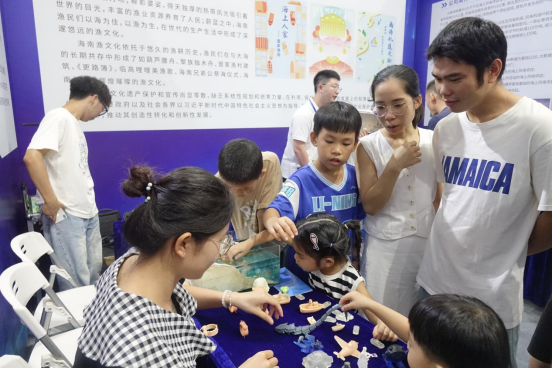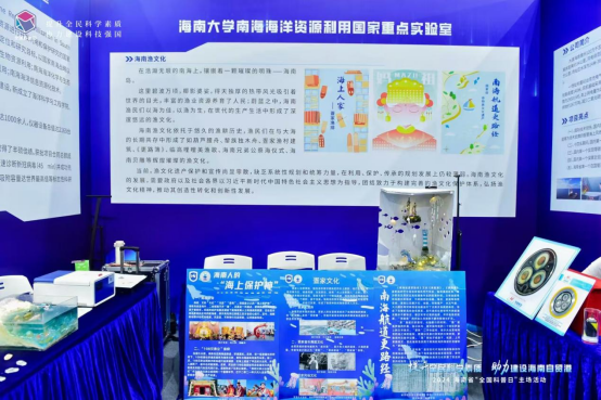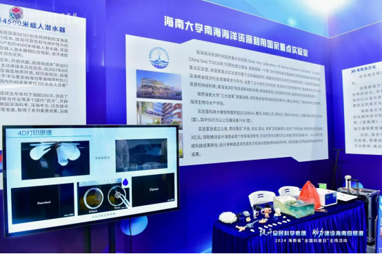 南海海洋資源利用國家重點實驗室的展臺上,一側是4D打印展品、手持余氯檢測儀、熒光光電微生物檢測儀、富氫水杯、光電一體化海洋氫能動力系統模型,一側是海洋文化藝術手工作品《瓊游四海》、《躍》和海南漁文化知識宣傳展板以及宣傳手冊,還設有海南省第二屆海洋文化科技創新創意大賽優秀作品展。豐富的展品,讓市民在領略先進科技的同時感受海洋文化的獨特魅力。