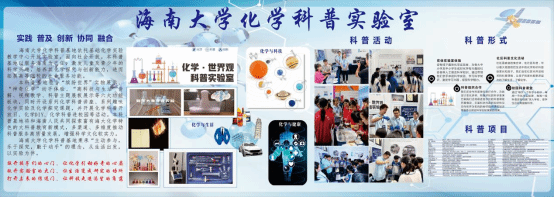 海南大學化學科普基地成立于2023年1月,現(xiàn)設有“海Na未來”化學科普實驗室,為“開放實驗室+科普基地”功能融合性實驗室,基地依托化學化工學院基礎化學實驗教學中心開放實驗室,位于海南大學基礎實驗樓4樓、5樓,占地面積約160 m2,2023年12月認定為海南省科普基地。科普基地面向社會開放,以服務社會為己任,激發(fā)各年齡段學生的科學興趣,培養(yǎng)化學探究與創(chuàng)新能力,拓展高等院校的社會服務功能??破栈匕袄_紛世界”實物展示、“神奇化學”動手體驗、“高科技與生活”講解、視頻教學、科普主題展板六部分,同時科普基地開設系列化學科普講座、系列趣味化學實驗及化學探究課題,開展化學科普開放日、化學DIY、化學科普進校園等活動。共同探索富有海大化學特色大科普教育新模式,多渠道、多維度推動科普服務高質(zhì)量發(fā)展,增強科學文化軟實力?!昂a未來化學科普實驗室”在海南大學儋州校區(qū)和海甸校區(qū)參與“全國科普日”活動多次,面向社會實現(xiàn)每月一次“科普開放日”活動,服務人數(shù)超3000人次。