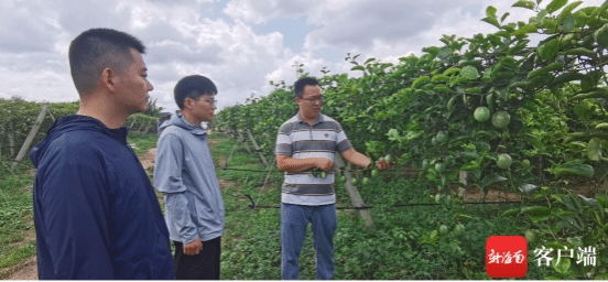 房傳營(yíng)副教授(右一)與兩名學(xué)生在基地內(nèi)查看百香果的掛果情況